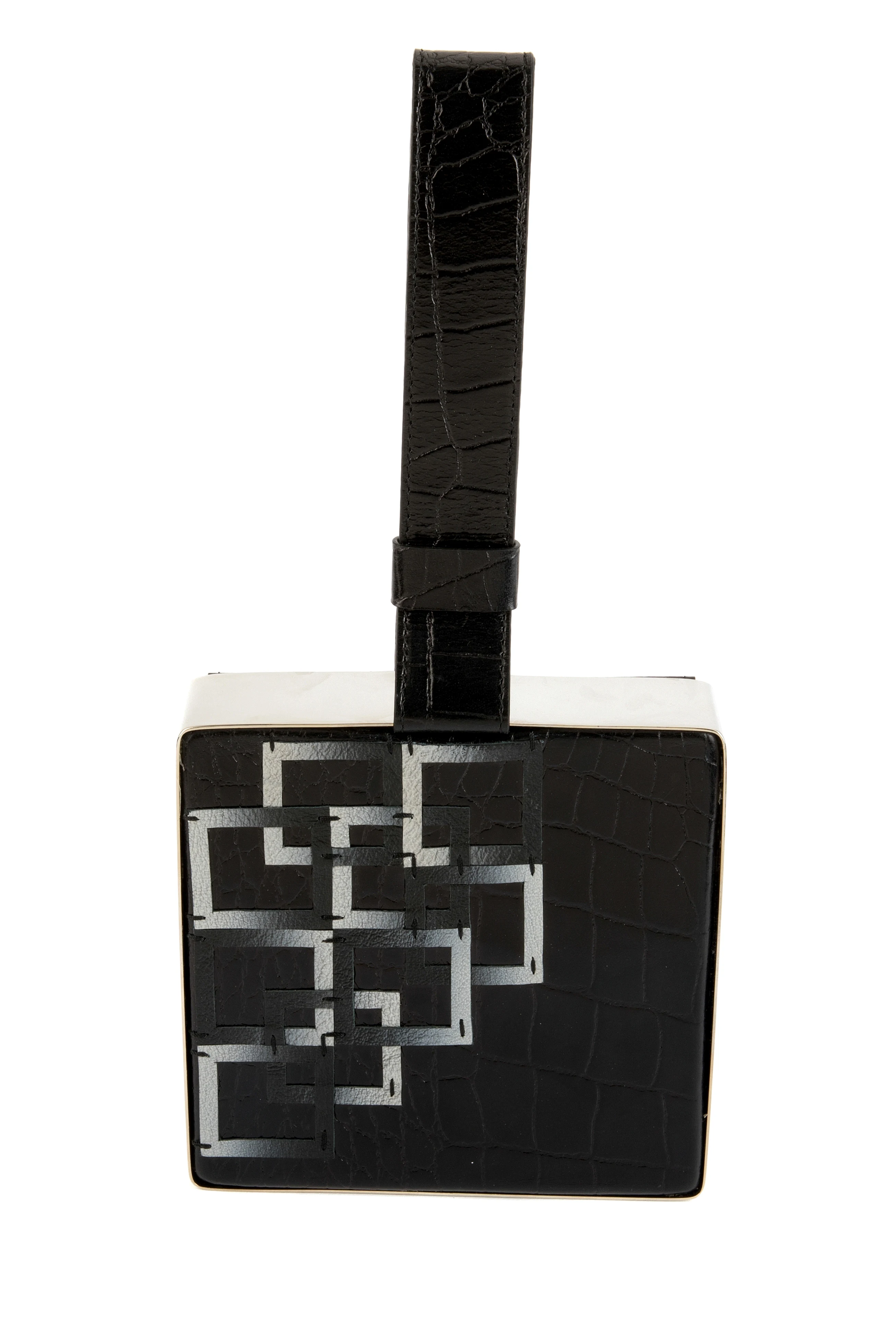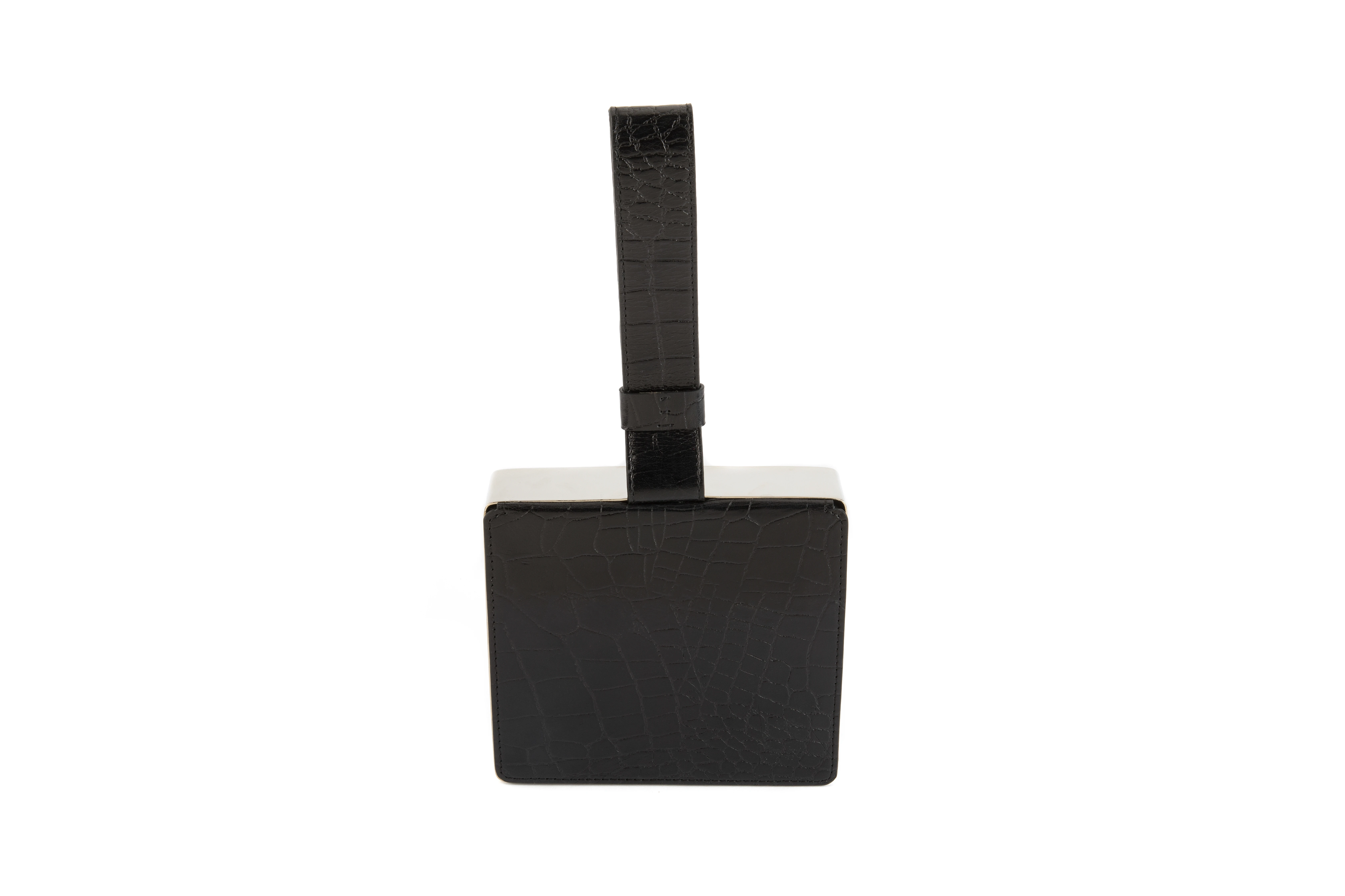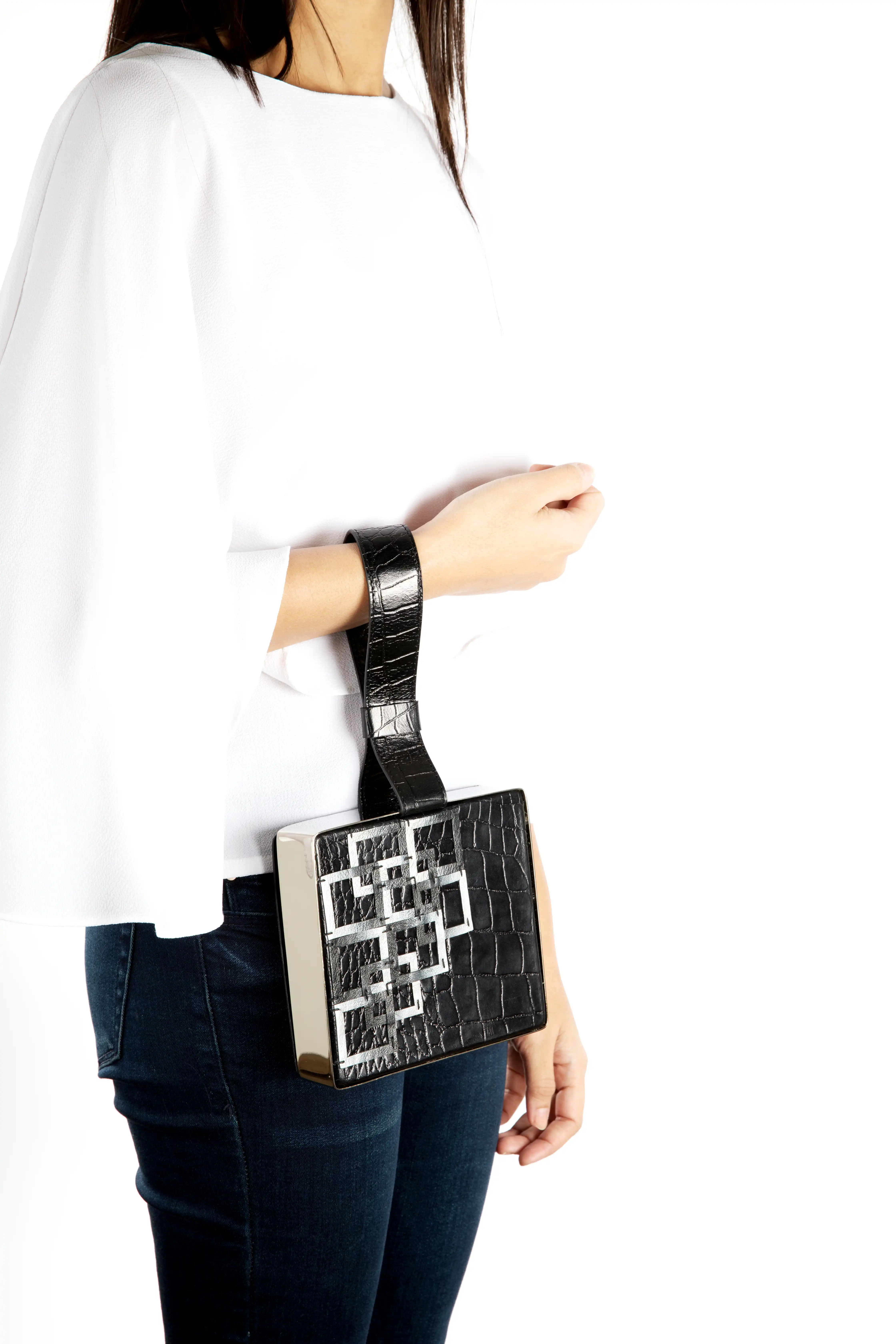 Square shaped thick metal frame encases croc print leather. Silver shaded square strips are stitched on in an interesting pattern. The clutch opens by lifting the back flap. It is shipped in a gift box with a dustcover.
