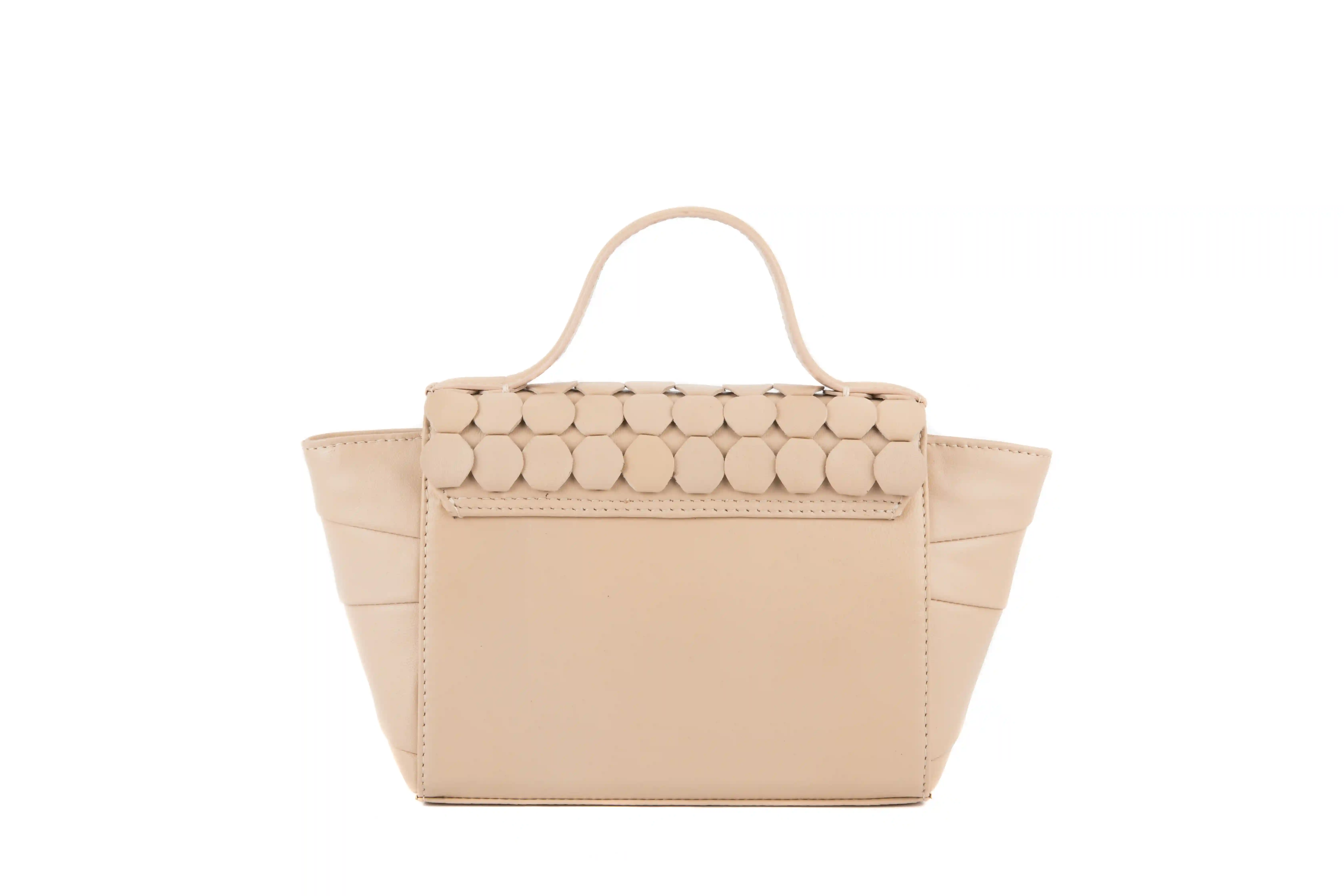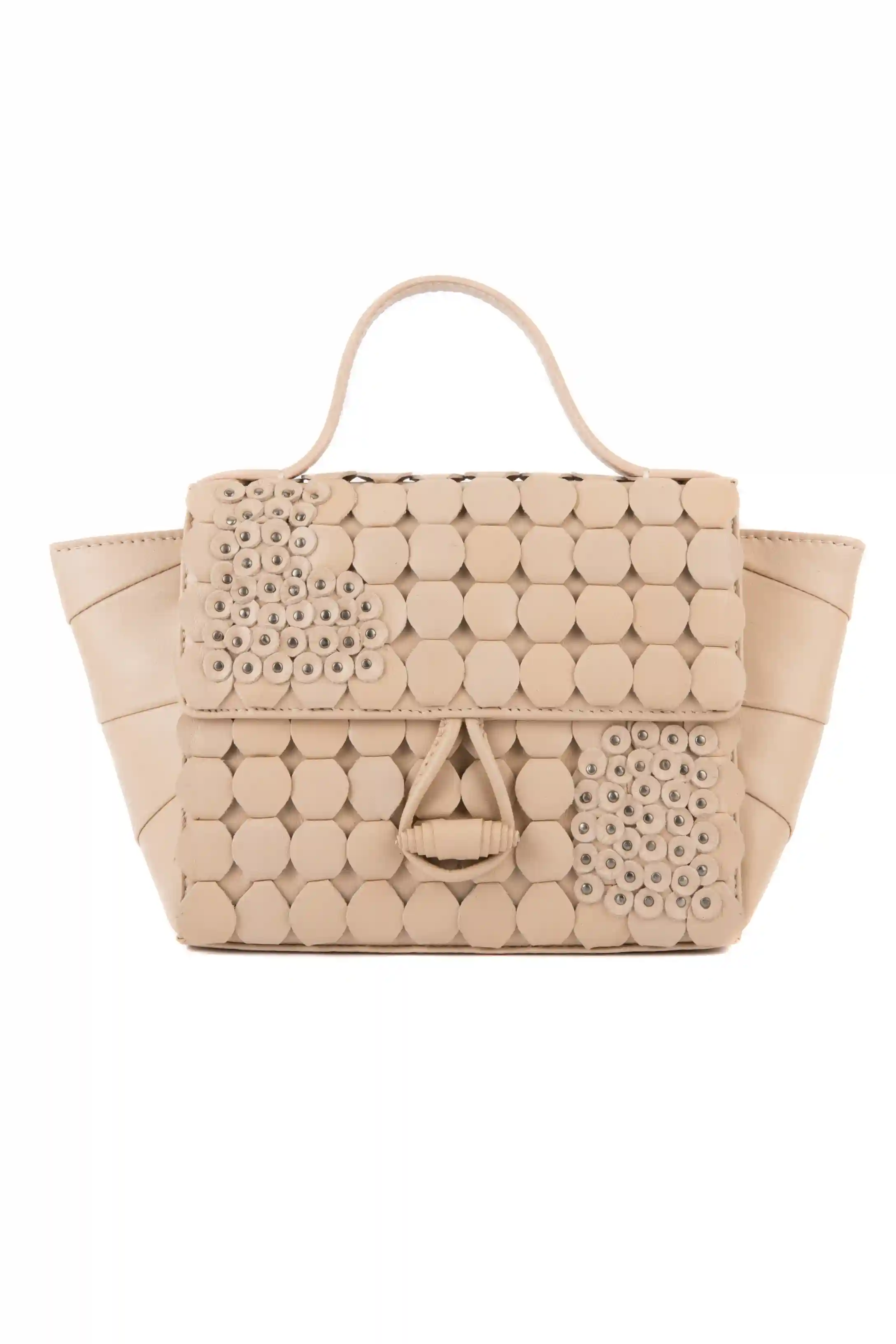 The clique of circles satchel features round leather circles woven together. Tiny leather circle clusters with studs are stitched onto the satchel. The lock is made of rolled up leather which loops around a leather noose attached to the flap. The satchel comes with a protective dust cover and is shipped in a gift box.