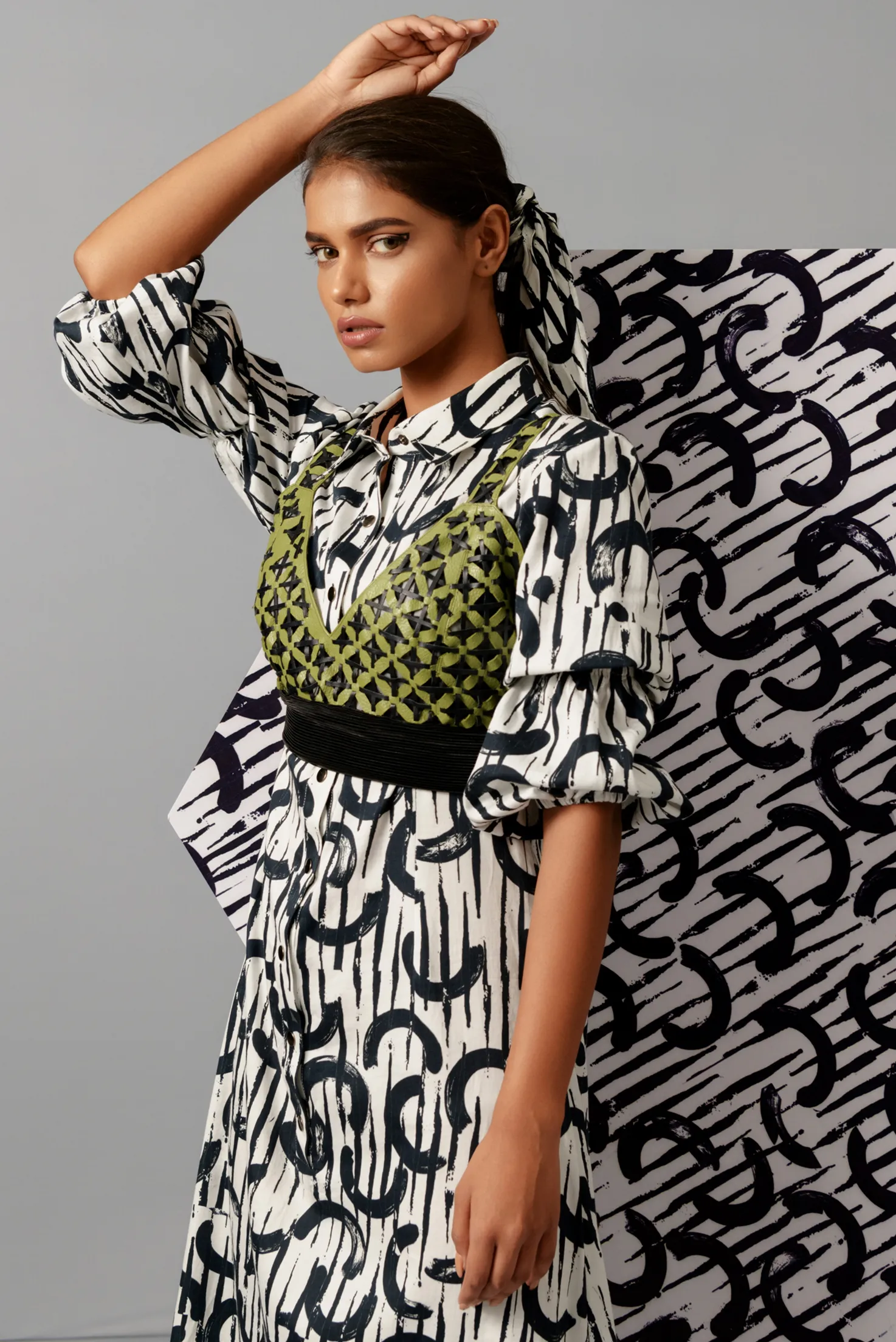 Bralette is  made using scrap leather and pleated fabric