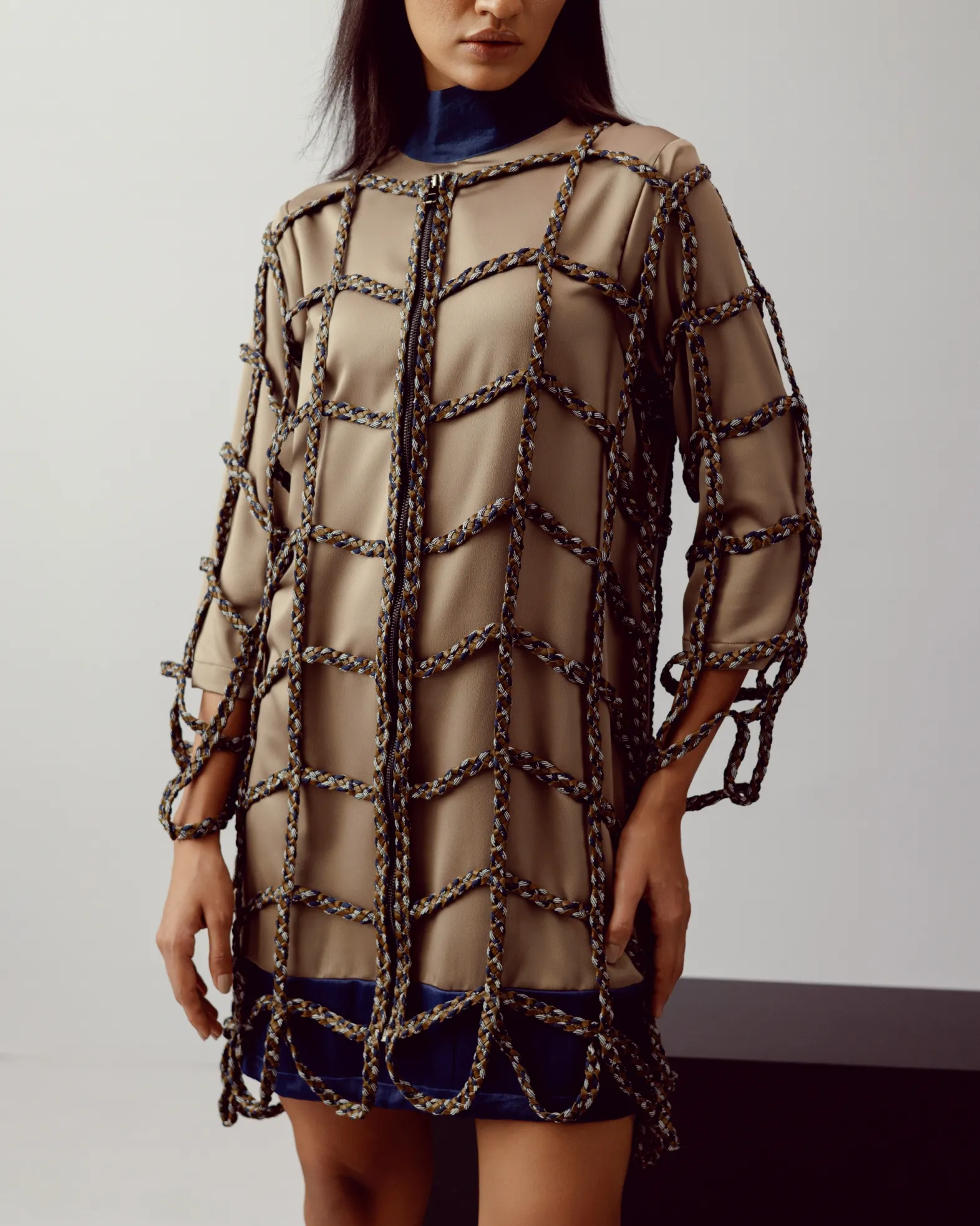 Inside highneck dress in crepe satin fabric