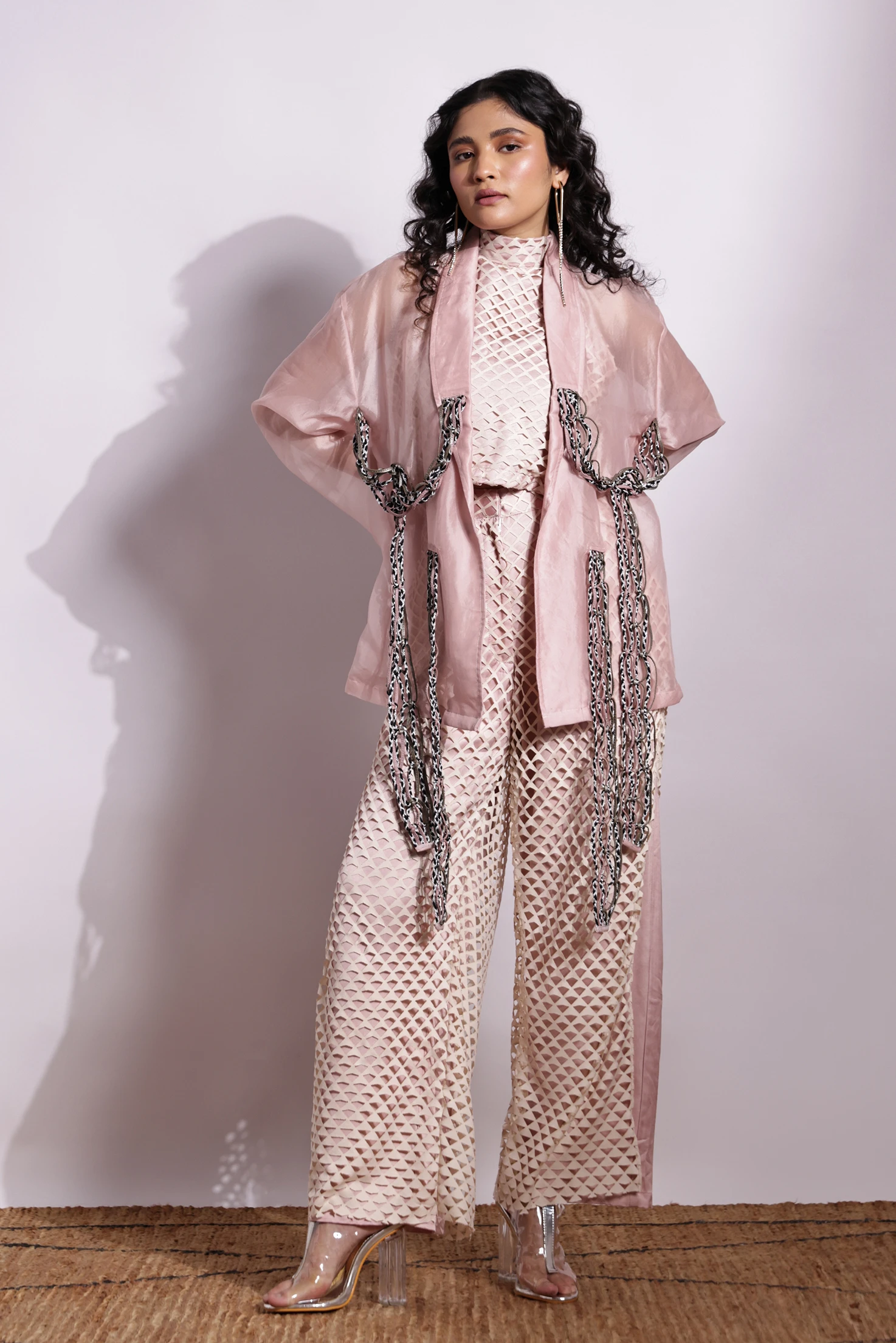 Lasercut Halter and Flared pant are in crepe fabric lined with Italian satin fabric