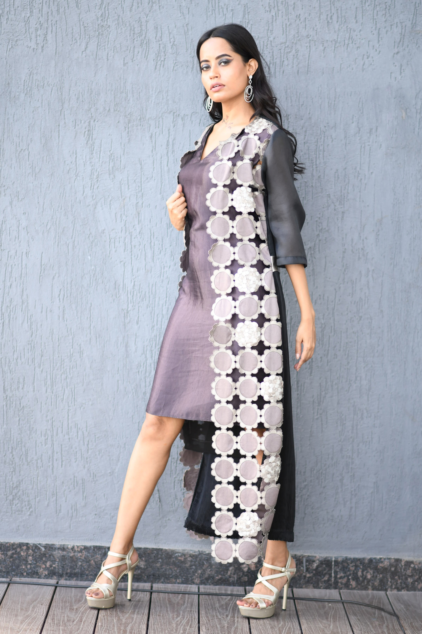 Dress front is in cotton –satin with organza sleeves while back is in pleated fabric