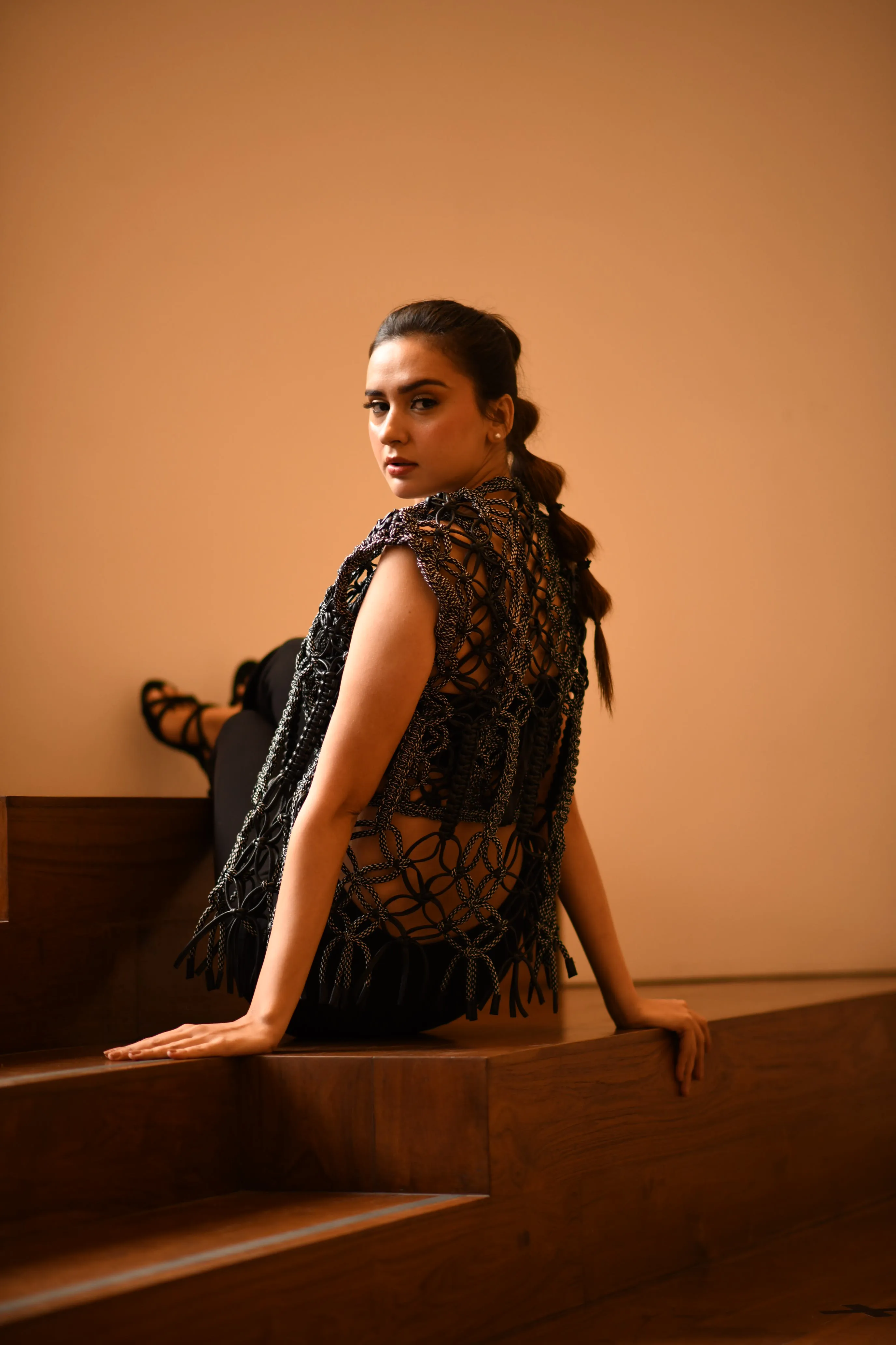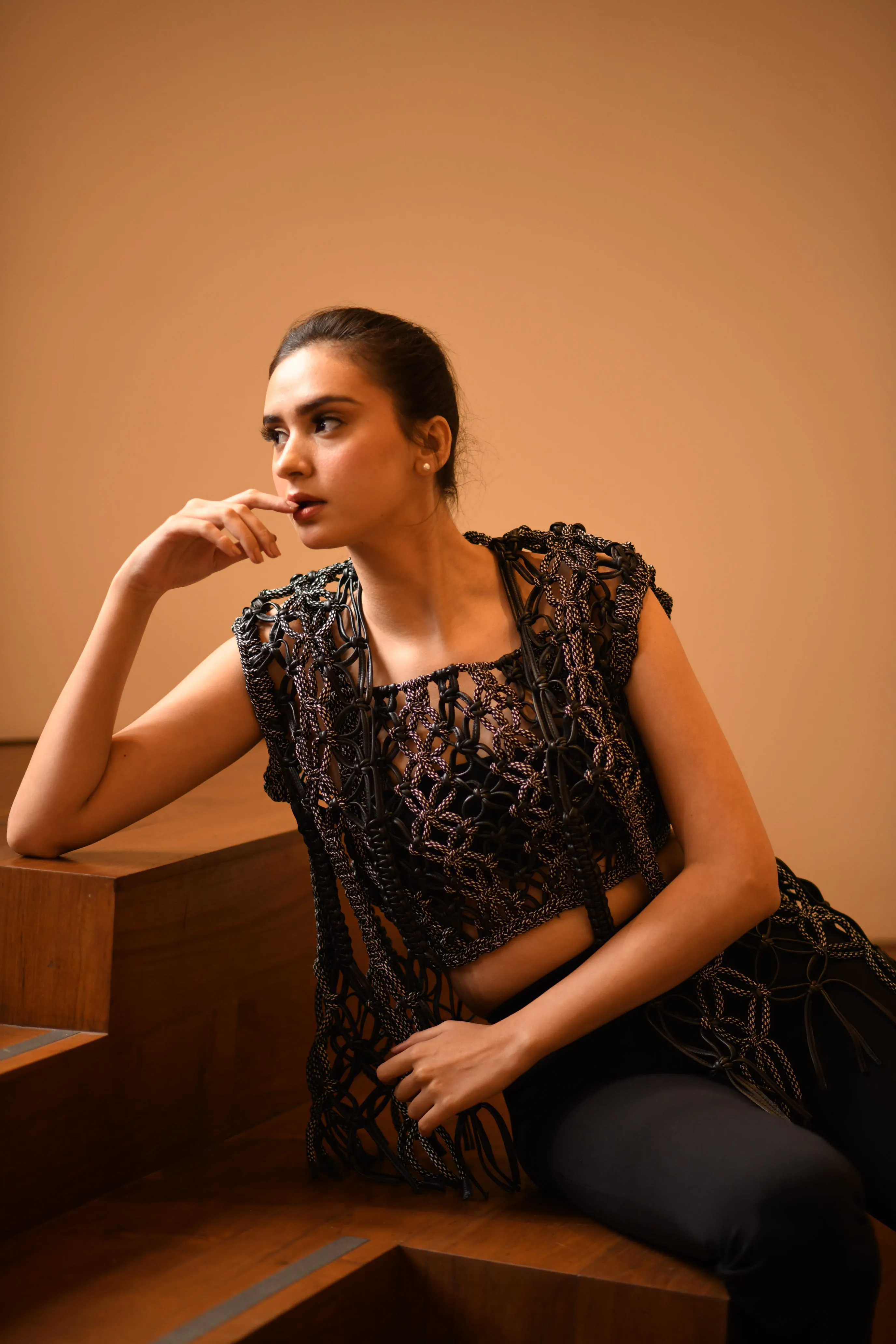 Handknotted leather and rope jacket.