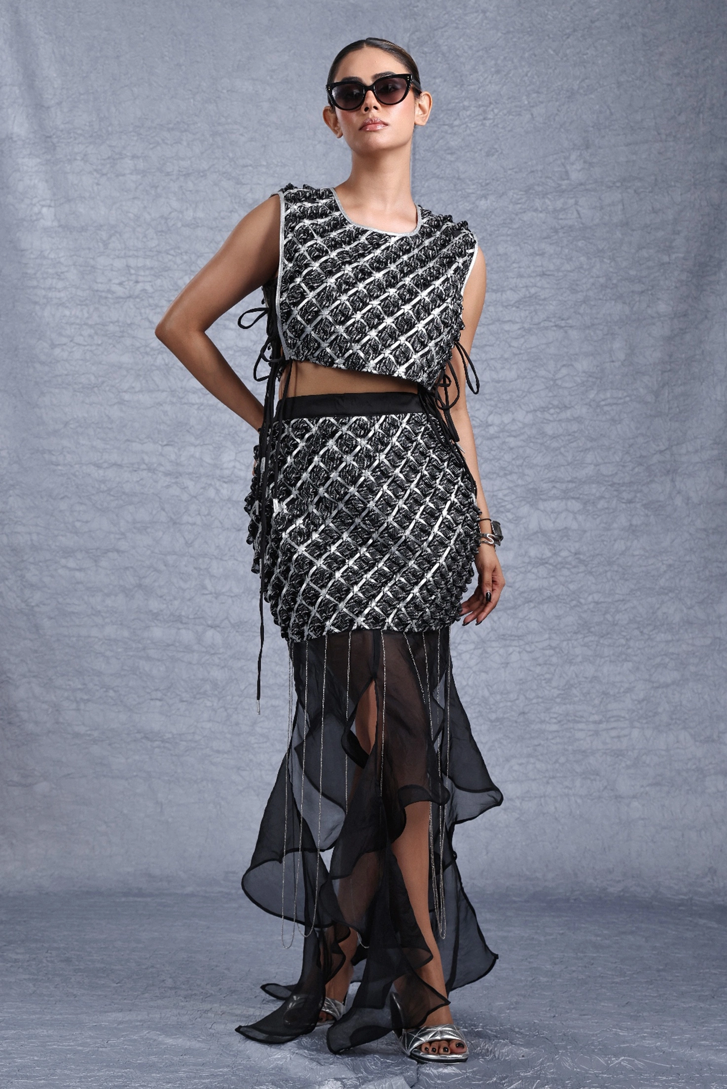 Fabric used for woven part is crepe while back panel is in crushed crepe - satin with silk - organza hangings