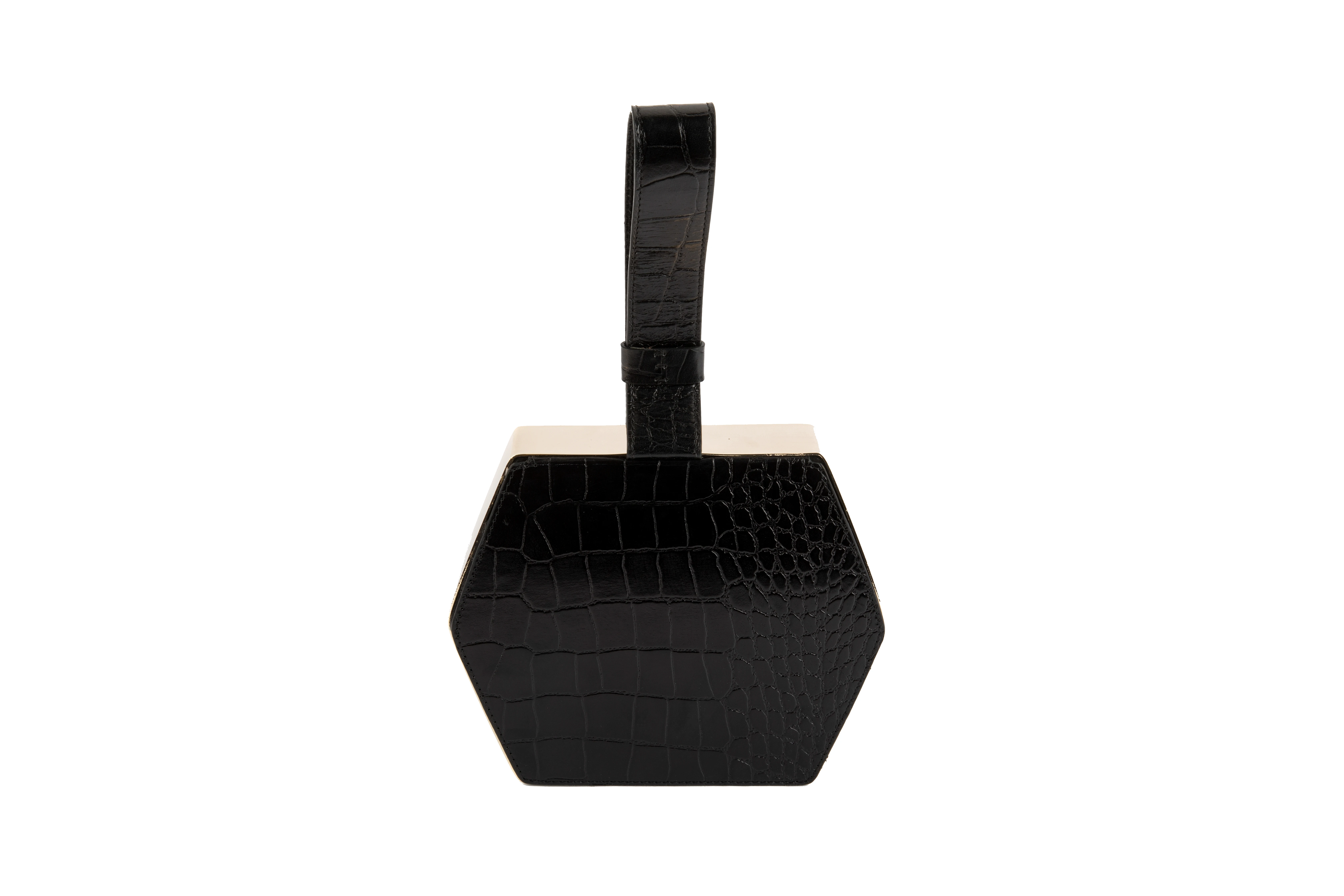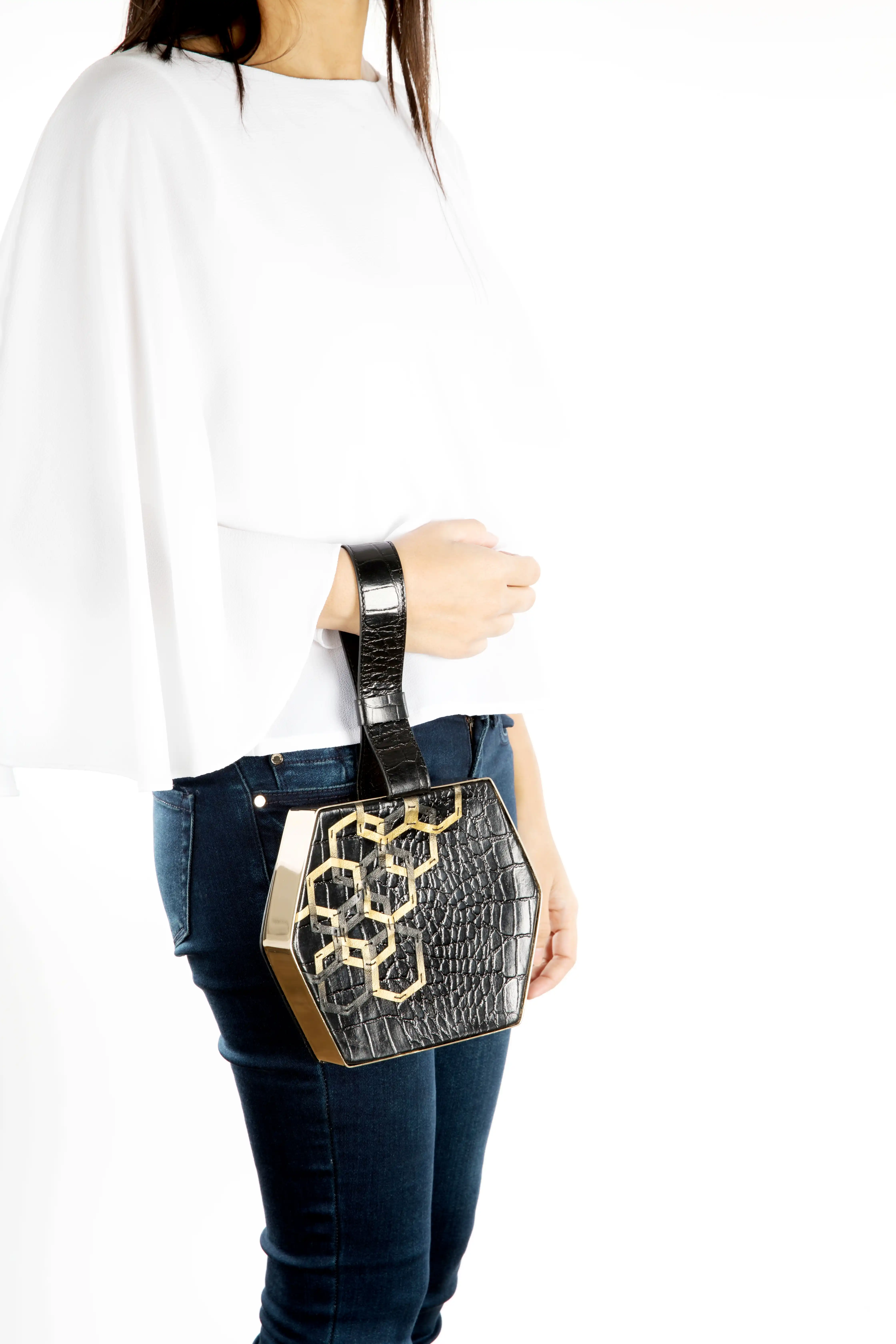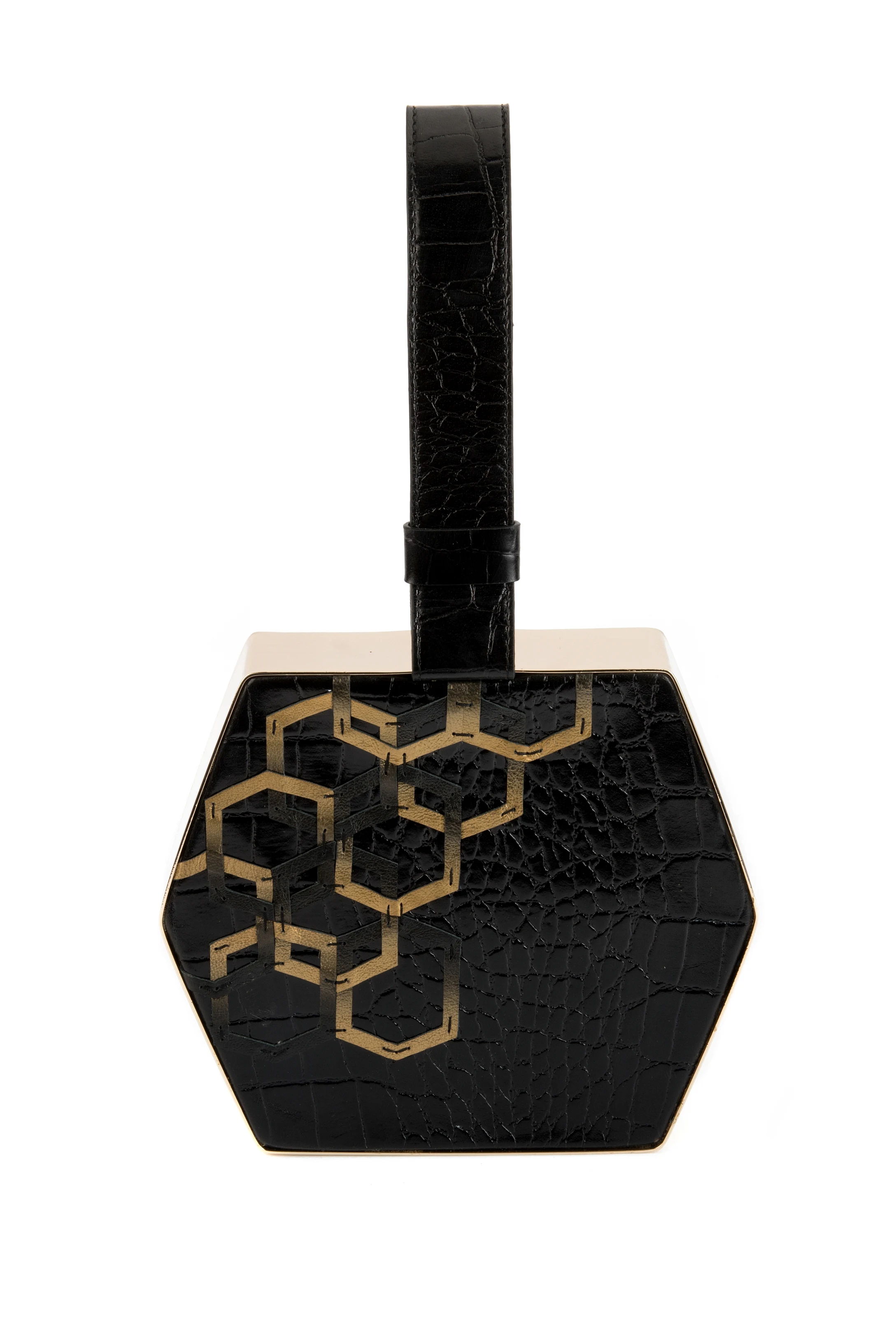 Hexagon shaped thick metal frame encases croc print leather. Gold shaded hexagon strips are stitched on in an interesting pattern. The clutch opens by lifting the back flap. It is shipped in a gift box with a dust cover.