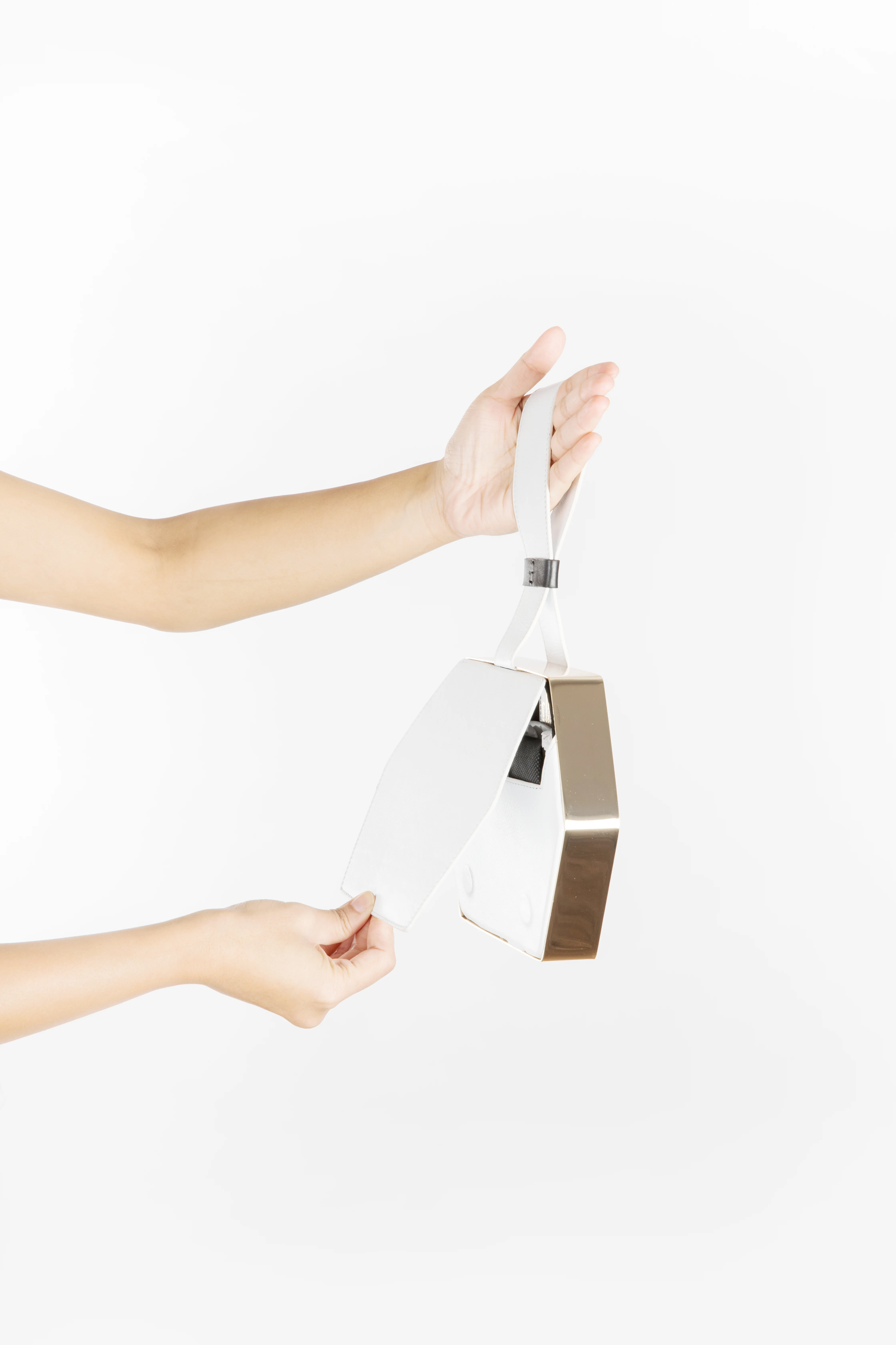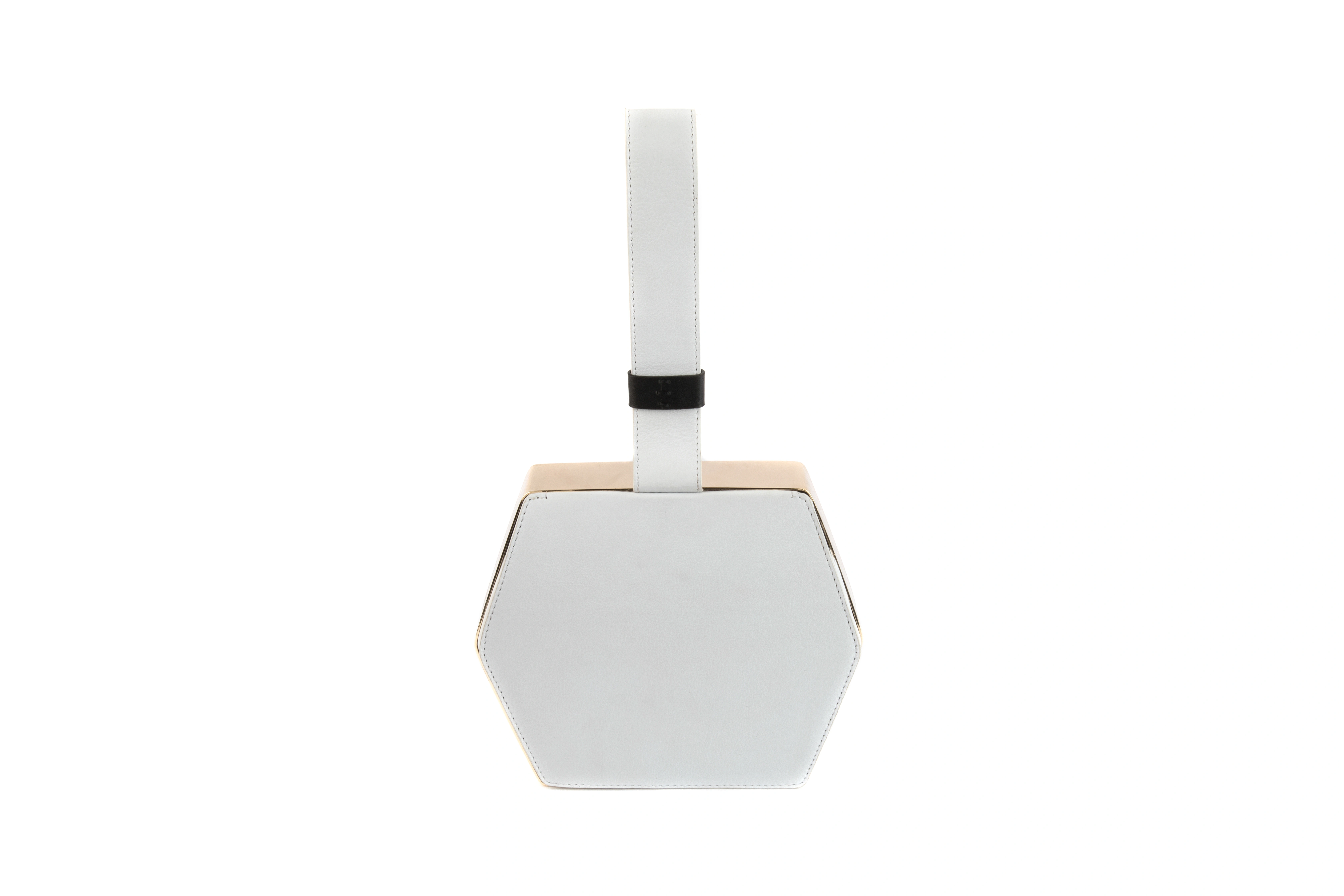 Hexagon shaped thick metal frame encases an abstract laser cut pattern. The white leather is laser cut and then stuck on a combination of black and grey suede. The clutch opens by lifting the back flap. It is shipped in a gift box with a dust cover.