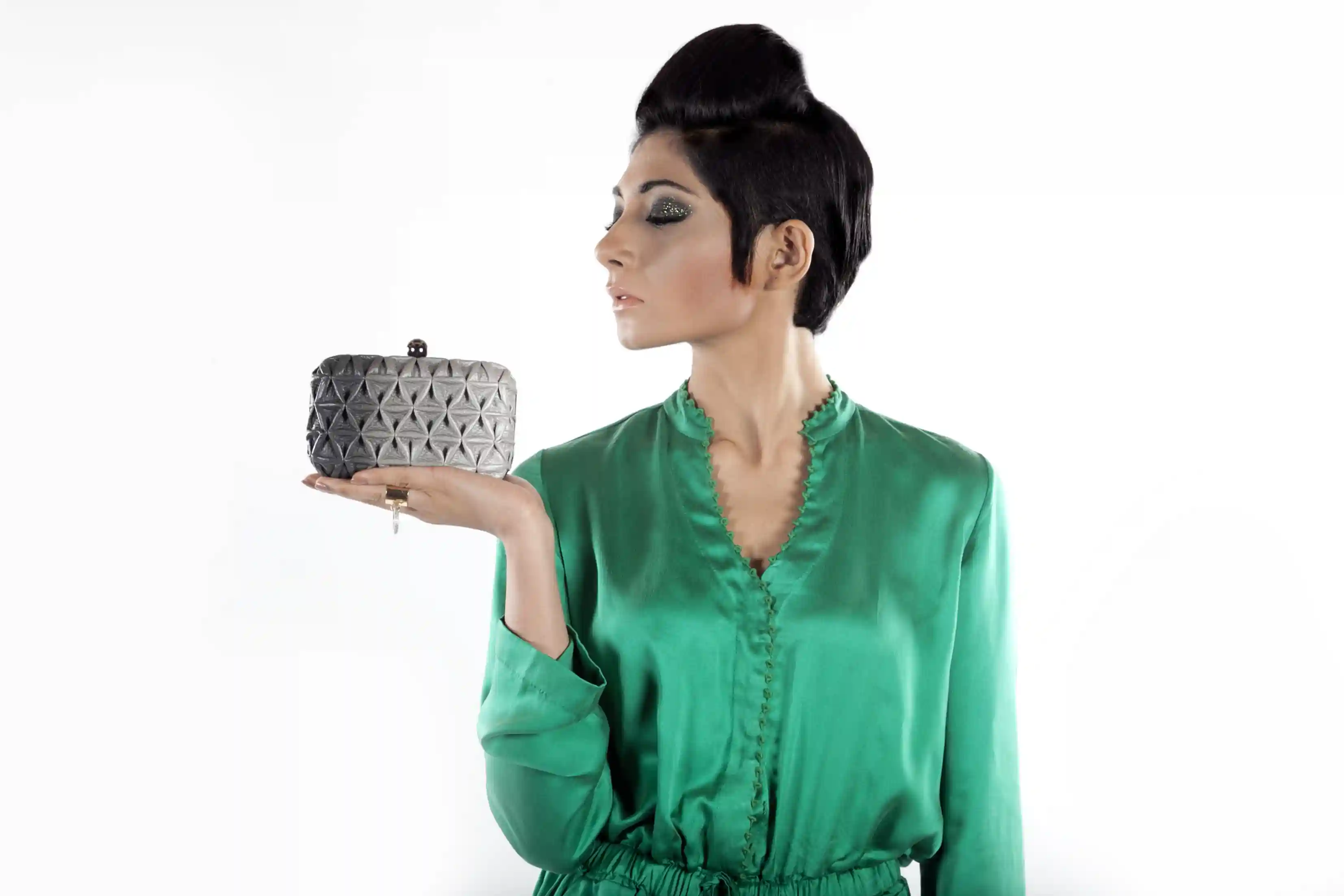 Hand shaded leather is stitched to create different surface textures. It is big enough to hold your phone, lipstick, keys and credit cards. Hold it like a clutch or sling it. Shipped in a gift box and includes a protective dust cover.