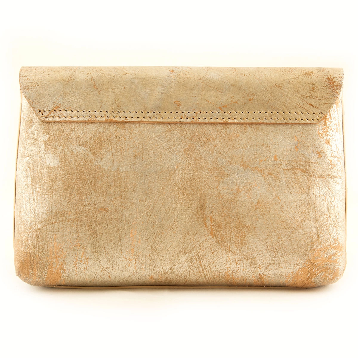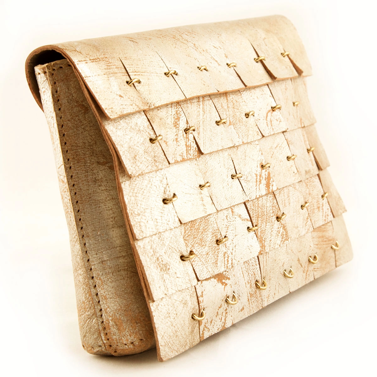 This unique collection is a result of a collaboration with a talented wall texturizer and the Devina Juneja team. The leather is given this antique metallic look through use of foil, lacquer, paint and heat. The leather is then cut in rectangular pieces and attached to one another through rings. The clutch is shipped in a gift box and includes a dust cover.
