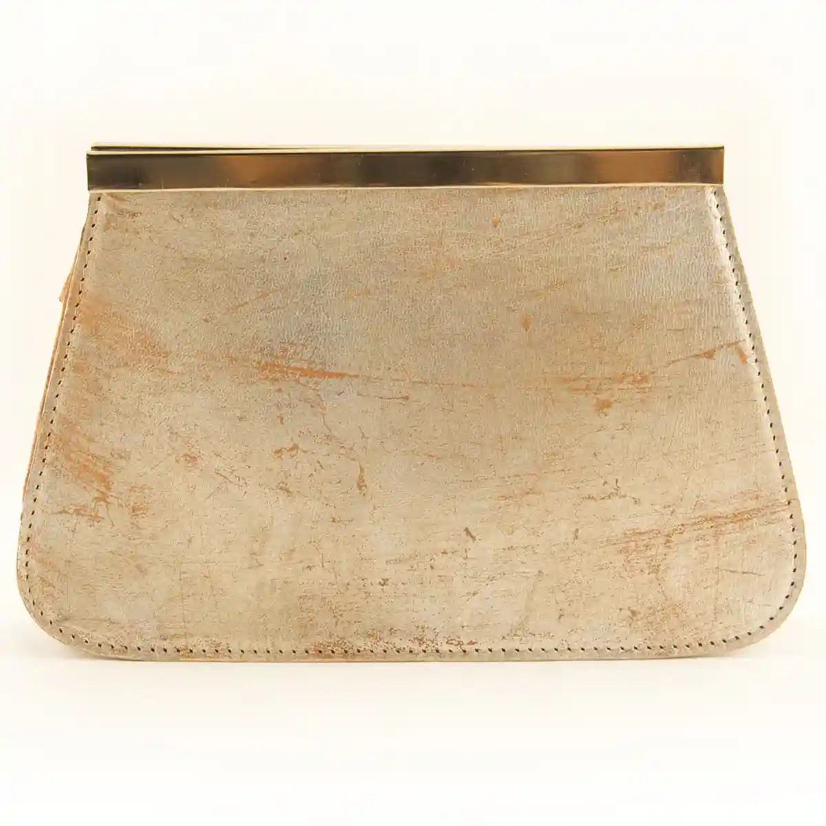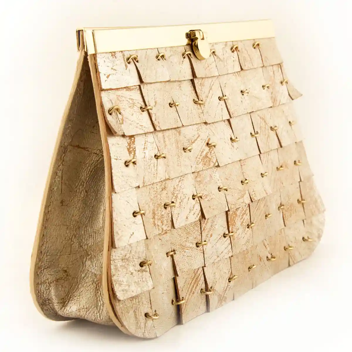 This unique collection is a result of a collaboration with a talented wall texturizer and the Devina Juneja team. The leather is given this antique metallic look through use of foil, lacquer, paint and heat. The leather is then cut in rectangular pieces and attached to one another through rings. The clutch is shipped in a gift box and includes a dust cover.