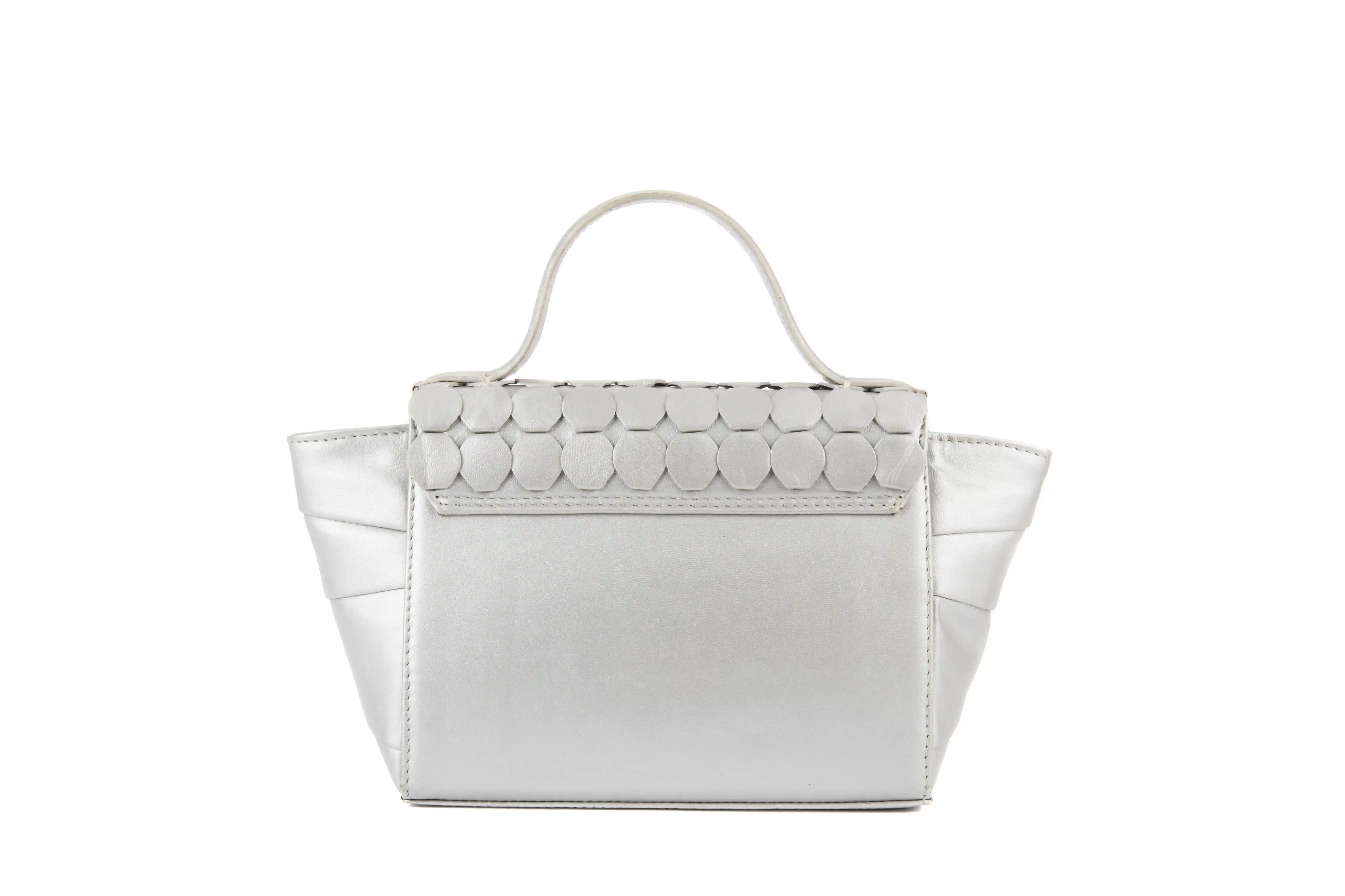 The clique of circles satchel features round leather circles woven together. Tiny leather circle clusters with studs are stitched onto the satchel. The lock is made of rolled up leather which loops around a leather noose attached to the flap. The satchel comes with a protective dust cover and is shipped in a gift box.