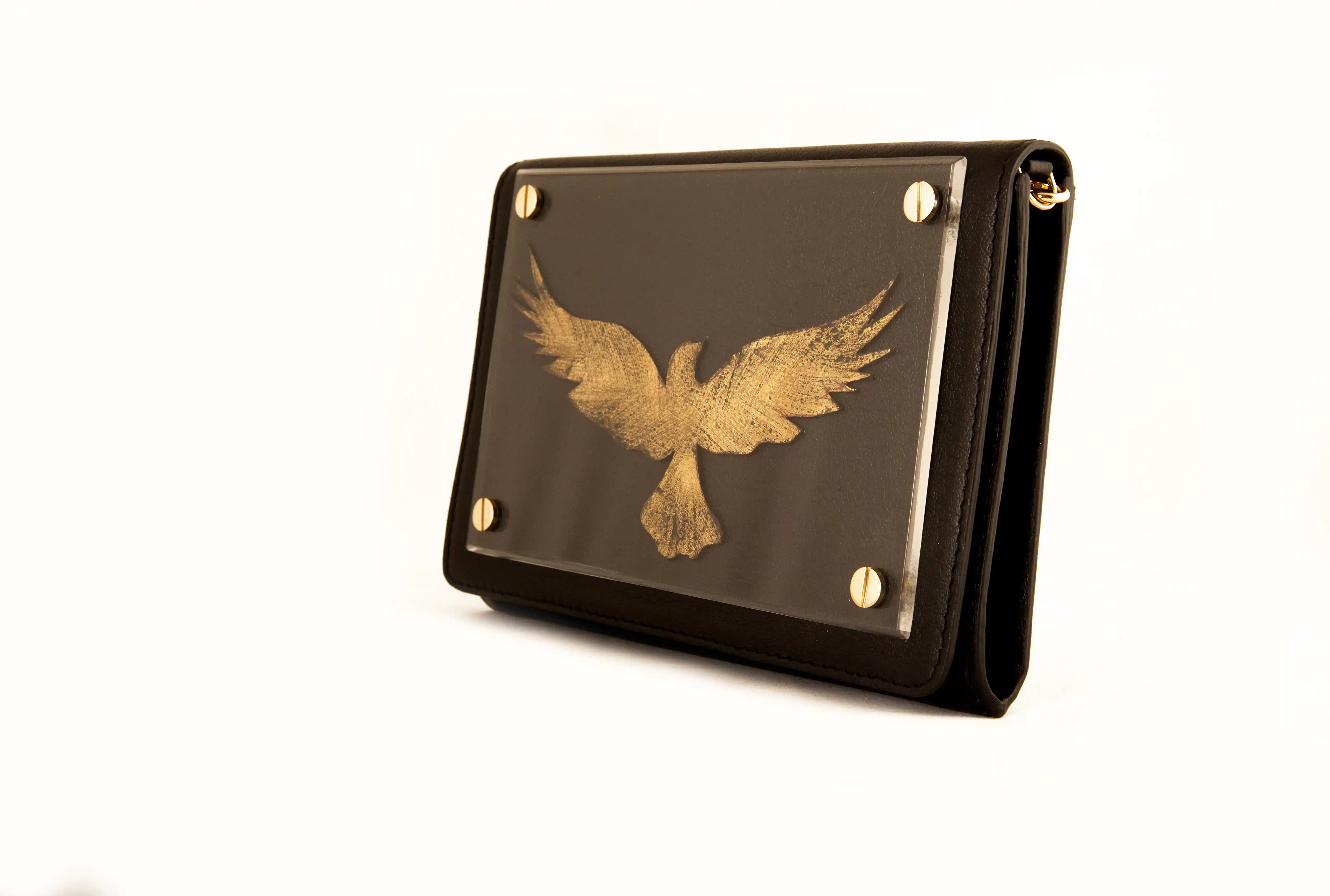 Featuring a bird made in 22 carat gold / silver foil, fixed on a leather base with screws behind a Perspex sheet. The clutch comes with a protective dust cover and is shipped in a gift box.