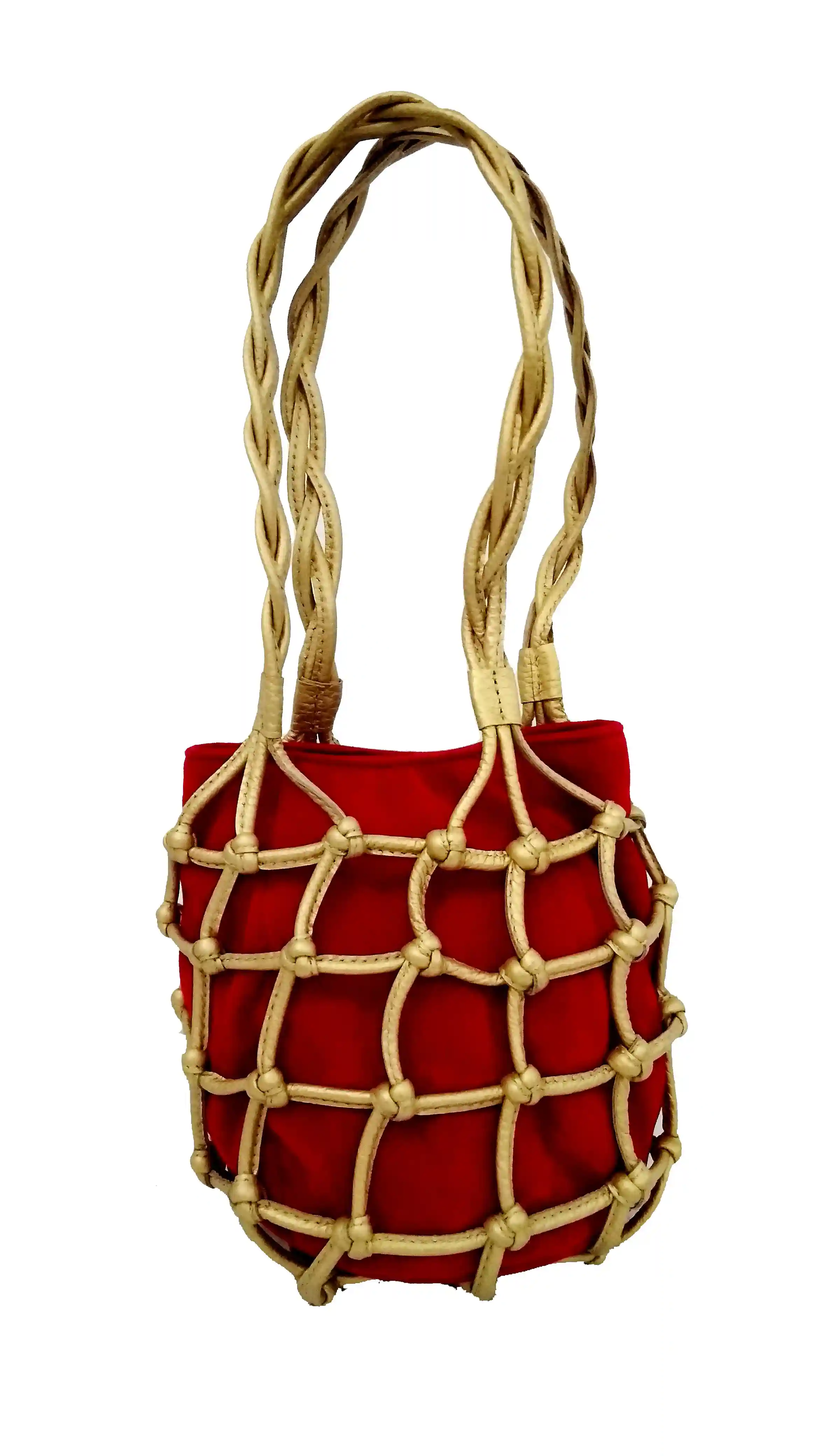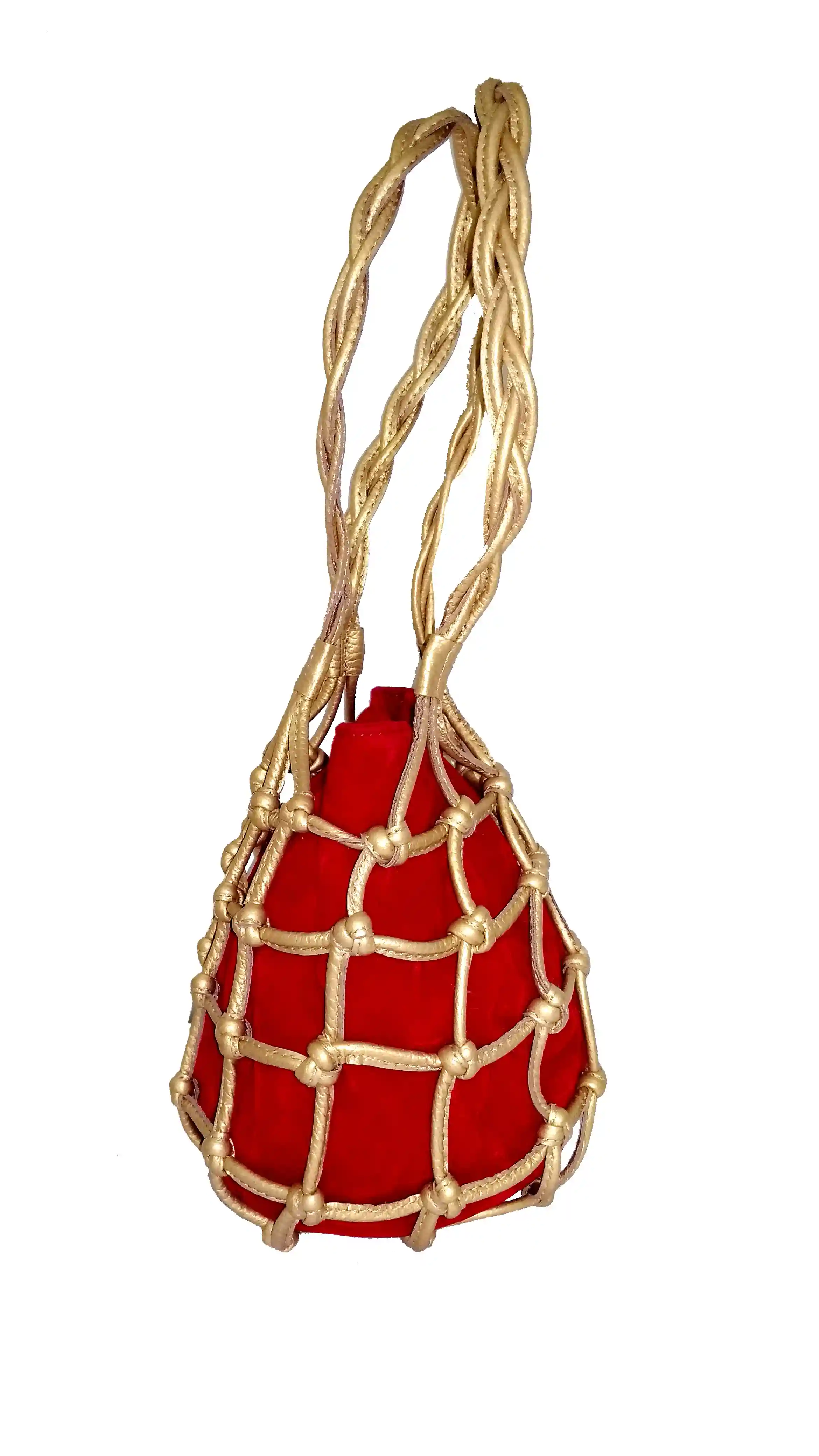 Intricate hand knotted ‘jaal’ leather polti. Two pouches that can be interchanged are provided with each bag, red and black for you to match with your outfit. Shipped with a protective cover in a gift box.